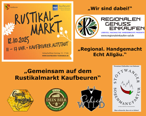 Am 12.10.2025 präsentieren wir uns beim Rustikalmarkt Kaufbeuren mit unserem großen Gemeinschaftsstand „Regionalen Genuss Einkaufen“.